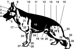 23 - предплечье 24 - локоть 25 - запястье 26 - пясть 27 - лапа 28 - бедро 29 - голень 30 - плюсна 31 - колено 32 - скакательный сустав 33 - хвост |