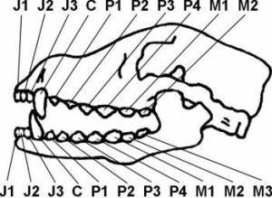 J - резцы (J1- зацепы, J2 - средние резцы, J3 - окрайки) С - клыки, Р - премоляры (Р1 - первые премоляры, Р2 - вторые премоляры, Р3 - третьи премоляры, Р4 - четвертые премоляры) М - моляры (М1 - первые моляры, М2 - вторые моляры, М3 - третьи моляры) |